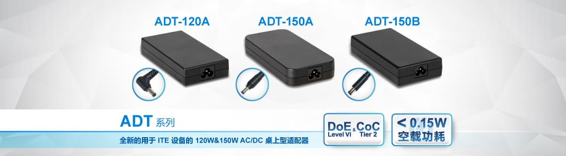 ADT-120A / ADT-150A / ADT-150B 系台达发布的 ADT 系列的最新机种,分别为单路输出 120W/12V、150W/12V 或 150W/24V,效率高达 92%,满足美国能源部(US DoE)Level VI 标准及欧盟 CoC (Code of Conduct) Tier 2 要求,115Vac 及 230Vac 输入下空载功耗低至 0.15W。