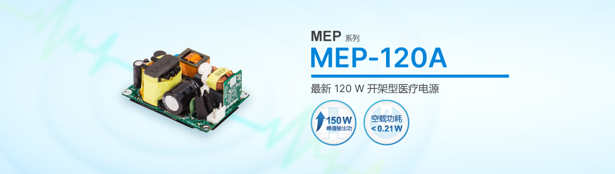 台达 MEP 开架型医疗电源系列,新推出输出功率达 120 W 的新机型 MEP-120A。MEP-120A采2 x 3 x 1.2英寸薄型机身设计,并提供 12 V、15 V、18 V、24 V 四种电压输出选择。MEP-120A峰值输出功率可达150 W 并维持10秒,具备 -30°C 至 70°C 宽温工作特性,50°C 至 70°C 范围采用降额设计。MEP-120A 空载功耗小于 0.21 W,安规设计符合2 x MOPP 绝缘等级规范,可应用于BF型医疗设备,如呼吸机、监护仪等。