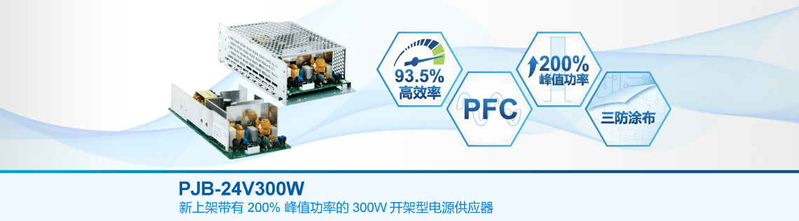 PJB-24V300W是PJB系列的扩增型号,具有可持续10秒200%的峰值功率。这种峰值功率能力确保诸如马达、泵、驱动器等机电负载可靠启动,毋须更高额定功率(通常是更大尺寸、更高价格)的电源供应器。内置主动式PFC,功率因数可达 0.99并符合谐波电流IEC/EN 61000-3-2标准。低漏电流、低浪涌电流以及电路板配备抗粉尘与化学污染物三防胶涂布。