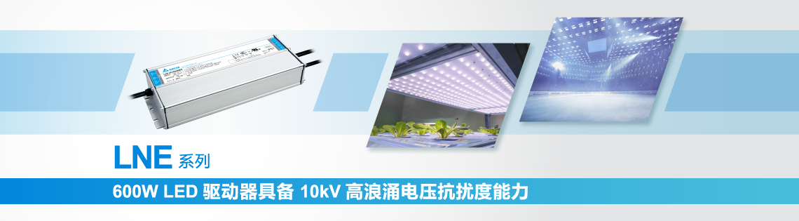 台达电子最新上架的 600W LED 驱动器通过严苛实验测试,达到室内室外高标准照明要求。 同为 LNE 系列的电源,共模与差模条件下浪涌抗扰度均可达到 10kV 的能力,并达到 IEC 61000-4-2 Level 4 Criteria A 标准及 IEC 61000-4-5 (6kV 共模与 4kV 差模) 标准。 输出电压 36V (LNE-36V600WBGA) 与 48V (LNE-48V600WBGA) ,-40°C 至 +70°C 宽范围 运行温度,自然对流冷却,效率可高达 96%,加上 IP67 设计使得台达 LNE 系列成为体 育场馆与农业照明节能 LED 电源解决方案不可或缺的一部分。