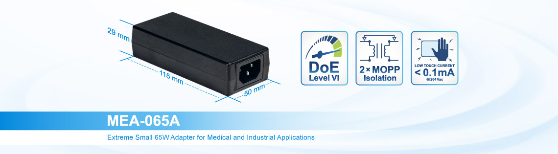 Delta Electronics has added the new 65W output to MEA Series of Medical AC-DC desktop type adapter. MEA-065A offers four single output voltages of 12V, 15V, 19V and 24V in an extremely compact size 50 x 115 x 29 mm (1.97” x 4.52” x 1.14”) suitable for various types of portable equipment such as home health care equipment, test and measurement equipment. Key features include 0.1mA low earth leakage and electric shock protection complying with 2 x MOPP.