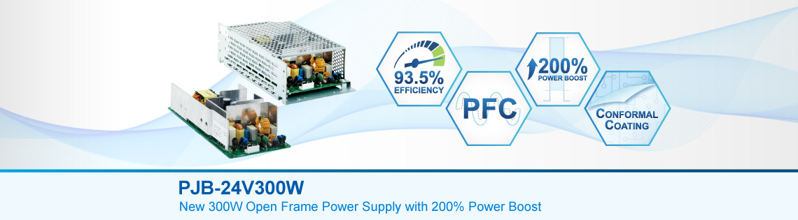 PJB-24V300W is part of the PJB series which offers a power boost of 200% for 10 seconds. This reserve power allows for reliable startup of electromechanical loads such as motors, pumps and actuators, thus eliminating the need for a higher power rated power supply, which is generally bigger in size and more expensive. There is built-in active PFC up to 0.99 and fulfills Harmonic Current Emission according to IEC/EN 61000-3-2. Other features include low leakage and inrush current. There is additional conformal coating on the PCBAs to provide protection against dust and chemical pollutants.