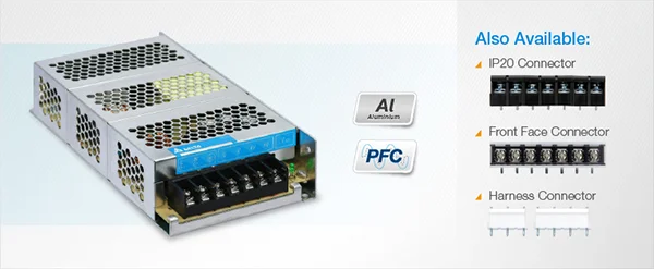 Delta ADT-090A24AA is the newest model in ADT Series up to 30% reduction in overall size. With an efficiency up to 91.5%, the ADT-090A24AA meets Efficiency DoE Level VI and no-load power consumption < 0.15W @ 115Vac and 230Vac input. The product offer single output voltage of 24Vdc with 90W output power and is suitable for general applications such as POS equipment and office equipment.