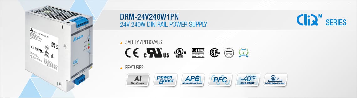Delta Electronics has added a 24V 240W (DRM-24V240W1PN) new model to the CliQ M series of DIN rail power supply. The CliQ M series is the slimmest amongst the CliQ family. Like the rest of the models in the CliQ M series, the DRM-24V240W1PN is designed according to major industrial and maritime safety standards in order to fulfill the stringent demands in maritime applications. Some of the features include built-in DC OK contact, LED indicator for DC OK/ Overload and full power from -25°C to +60°C operation at 5,000m or 16,400 ft. altitude.