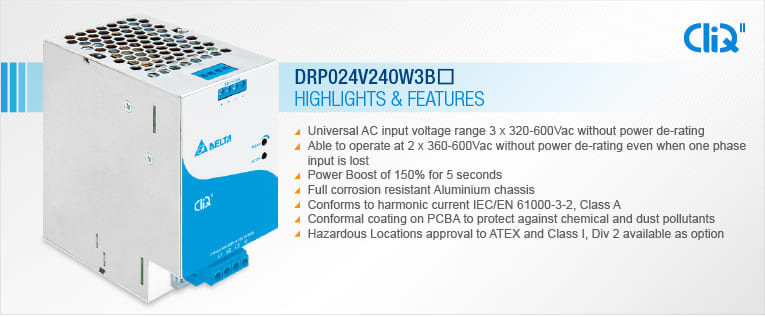 Delta Electronics extends the 3-phase models for its CliQ II DIN Rail Power Supply series with a 240W product offering 24V output voltage. The DRP024V240W3BA is encased in a sturdy and non-corrosive full aluminium body that can withstand shock (30G) and vibration (3G) according to IEC 60068-2 standard and operates over a wide temperature range from -25°C to +75°C.