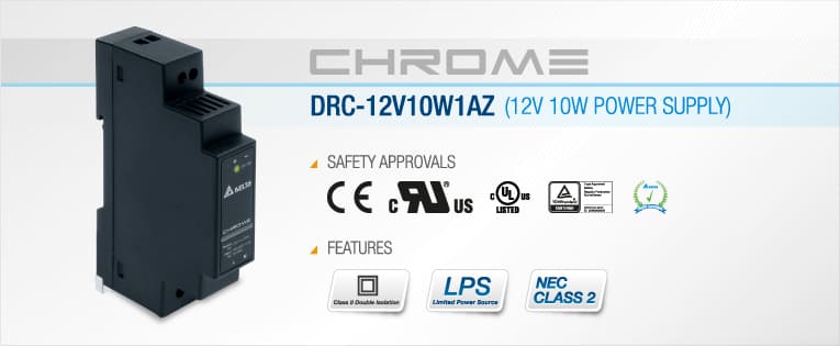 Delta Electronics extends its Chrome DIN rail power supply series of 10W product with 12V output voltage. The DRC-12V10W1AZ  provides Class II Double Isolation and are widely adopted in home automation and Food & Beverages industries. The double isolated input eliminates the need for Earth connection, thus, resulting in very low leakage current. The Chrome series is suitable for use in compact cabinets and the DRC-12V10W1AZ  measures only 55.6 mm thick and 91 mm tall. Features include overvoltage, over temperature and overload protections.