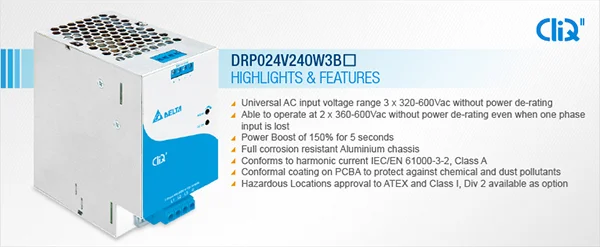 Delta Electronics extends its Chrome DIN rail power supply series with a 60W product offering 24V output voltage. The Class II double isolation power supply is designed for use in compact cabinets. The DRC-24V60W1AZ requires less installation space with its compact body measuring only 55.6mm thick and 91mm tall. The design not only does not require earth connection, it also has very low leakage current and is thus especially useful for home automations and the food and beverage industry.