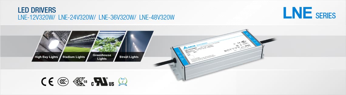 All models in the LNE series are encased in a full corrosion resistant aluminum casing and rigorously tested for the highest quality. High surge immunity (common mode: 6kV, differential mode: 4kV), MTBF > 700,000hrs and compliance to IP65/IP67, all make the Delta LNE series an essential part of an energy efficient LED lighting power solution for both indoor and outdoor applications. In addition, the product comes with major international safety certifications and is compliant with EN 55015 Immunity/ Emissions/ Harmonic requirements.