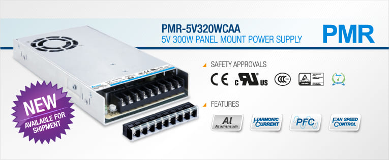Delta introduces the first model in its new PMR panel mount power supply series. The PMR series is designed for LED signage application where efficient heat dissipation for the components are crucial in a low profile control cabinet. At only 30mm height and encased in a full corrosion resistant aluminium casing, the PMR series is made for installation in narrow space. The PMR-5V320WCAA has built-in active PFC circuit which provides high power factor values and conform to harmonic current IEC/EN 61000-3-2, Class A and Class D. Another excellent feature in the PMR-5V320WCAA is its built-in fan with automatic speed control that provides highly efficient thermal management.