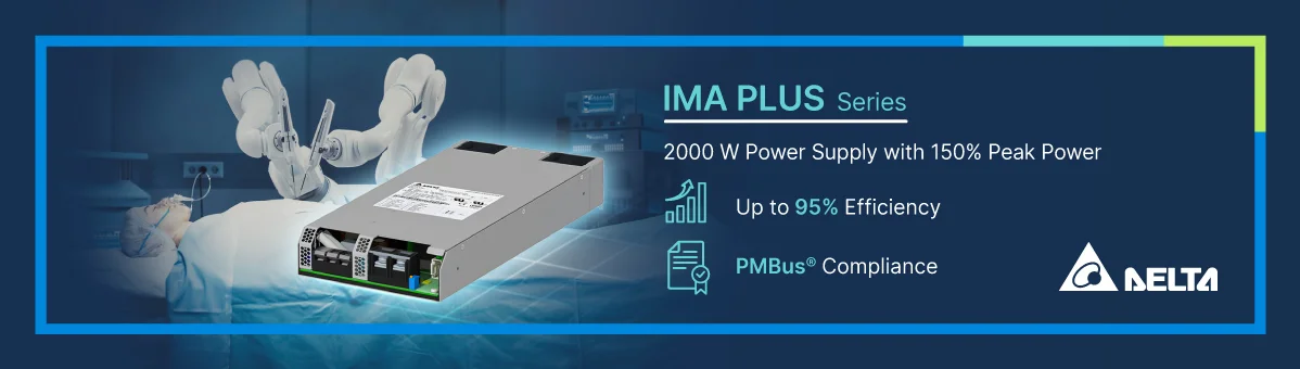 Delta introduces the new 2,000 W model for its IMA PLUS Series AC/DC power supply, which is designed for medical and industrial applications. The IMA PLUS 2,000 W offers a main output of 24 V or 48 V, alongside a standby output of 5 V / 2 A, and a universal wide range AC input from 80 VAC to 275 VAC. Their compact design, measuring just 12.2” x 5” x 1.6”, ensures efficient utilization of space without compromising on performance.