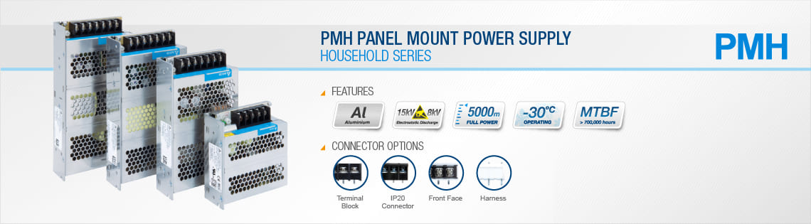 The PMH series is specifically designed for household electrical appliances with safety approvals including IEC/EN 60335-1 and IEC/EN 61558-2-16 as well as IEC/EN/UL 60950-1. The series provides connector options consisting of Terminal Block, IP20, Front Face and Harness connectors.
