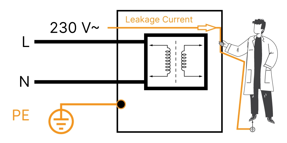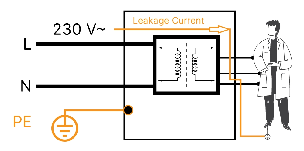 Leakage current is any current which has no functional purpose. It will flow from an intended circuit either to earth or a chassis for example. It can be generated due to a number of reasons such as parasitic capacitance in a transformer, non-perfect insulators and capacitive coupling from EMC filter circuits. It not intended to be applied to a patient body and is therefore restricted to non-hazardous levels by IEC 60601-1. Two types are relevant for medical power supplies: Earth Leakage Current and Touch Current (previously referred to as Enclosure Leakage Current in Edition 2).