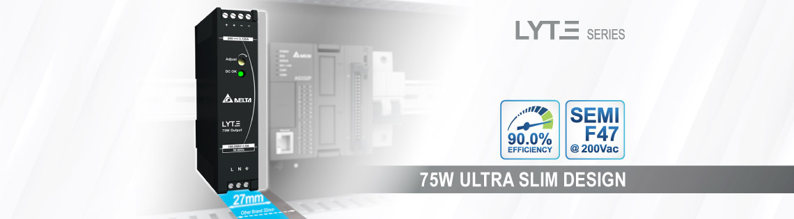 Delta introduces the slimmest model in the Lyte series of DIN rail power supply. It is a 75W DIN rail at 27mm wide. It comes with 12V (DRL-12V75W1AZ), 24V (DRL-24V75W1AZ) and 48V (DRL-48V75W1AZ) output voltages, which can easily fit into a space-constrained control panel. Based on a convection-cooled design, the Lyte series operates between -20°C to +70°C, with full power available from -10°C to +50°C at 230Vac. It allows cold start at -30°C even in extreme condition. The overcurrent protection is designed to operate in constant current mode, which makes the product suitable for inductive and capacitive load applications.