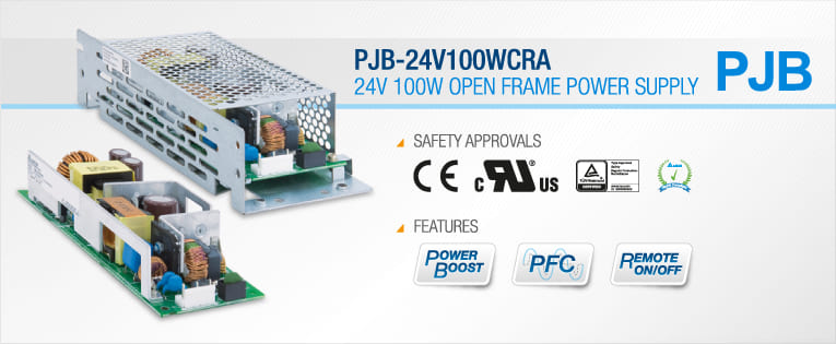 Delta Electronics introduces the first model in its new PJB open frame power supply series. The PJB-24V100WCRA power supply offers universal input from 85Vac to 264Vac with nominal output voltage of 24V. The PJB open frame power supply offers 200% Power Boost from the rated output power for 10 seconds. The Power Boost enables reserved power to be always available during startup of load with high inrush current. Like the rest of the PJ series power supply, conformal coating is applied on the PCBAs to protect against dust and chemical pollutants and only recognized Japanese capacitors are used so as to enhance product reliability.