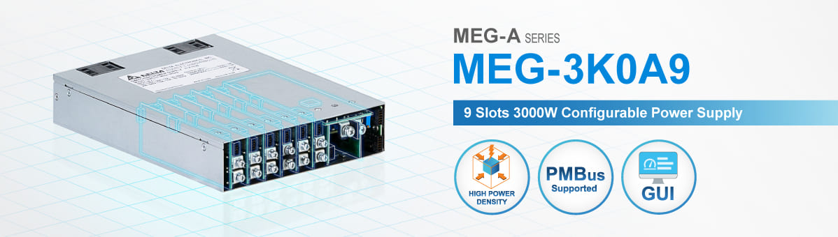 Delta’s newest 3000W output power supply to the MEG-A Configurable Series. The MEG-3K0A9’s power density is up to 27W/inch³ in 7” x 10” x 1.59” package with a total output of 3,000W up to 18 isolated outputs. Each individual output can be configured between 2Vdc – 60Vdc, output current up to 45A with single slot single output module, up to 100A with a triple slot single output module. Features included current sharing, PC GUI for easy parameter setting and monitoring, and intelligent fan speed control. Communication adapter can convert PMBus to USB, RS232 or RS485 interface and also available for 3 input connector options; EU terminal, US terminal and C22.