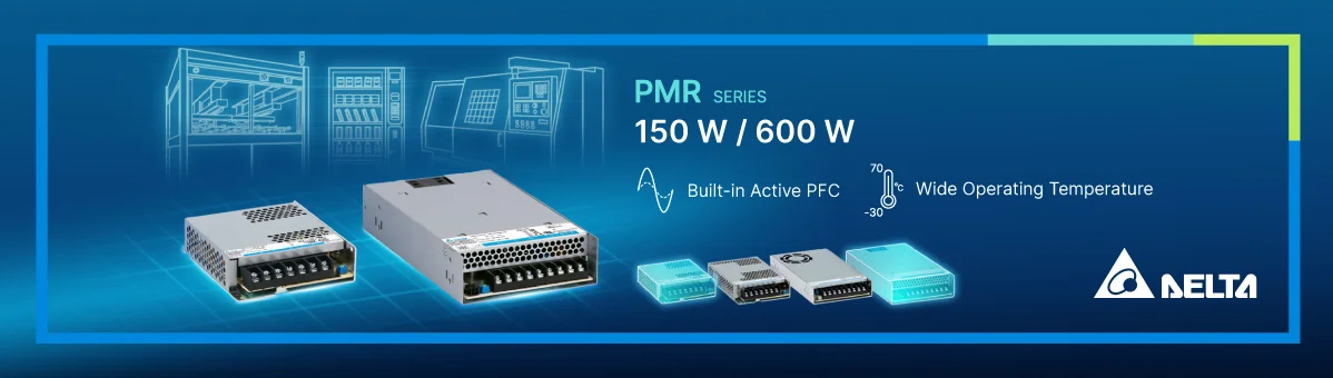 Delta proudly announced the addition of 150W and 600W models to its panel mount power supply PMR Series with maximum power outputs of up to 158.4 W and 600 W respectively, a testament to Delta’s capability to offer a diverse range of power outputs to meet market demands. The two models offer nominal voltage options of 12 V, 24 V, 36 V, and 48 V. Featuring the 1U low-profile form factor, the two models are suitable for limited-space installations, such as factory automation, machinery, household appliances, vending machines, and test & measurement equipment.