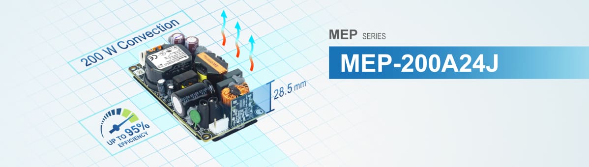 Delta launches the new 200 W output model (MEP-200A24J) for the MEP series medical power supplies. The MEP-200A24J operates over the input voltage range 90 – 264 Vac and can deliver up to 200 W output power with convection cooling in a small footprint and low profile. It provides 24 V output with high efficiency up to 95%, high power density up to 22.32 W/inch3 and wide operation temperature from -30°C to 70°C.