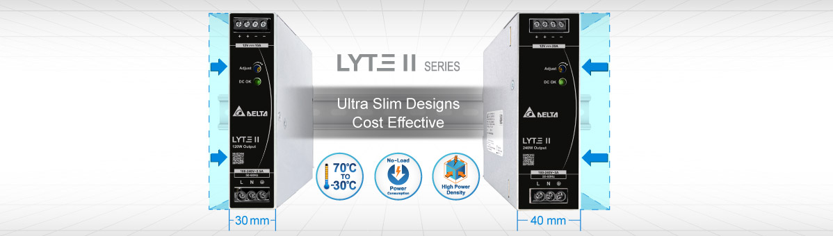 Delta’s newest LYTE II series of DIN Rail Power Supply is up to 30% slimmer compared to its LYTE I version. It can help to save precious installation space. The series offers choices of 12V, 24V and 48V nominal output voltages in 120W and 240W. The overcurrent protection is designed to operate in constant current mode, which makes the LYTE II series suitable for inductive and capacitive load applications.
