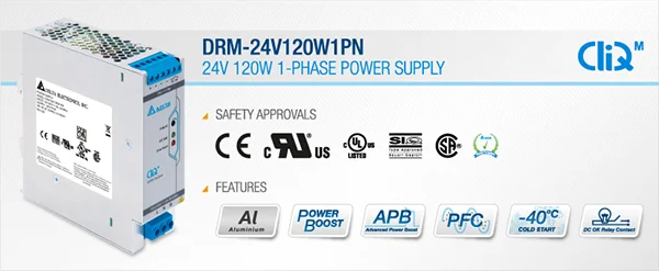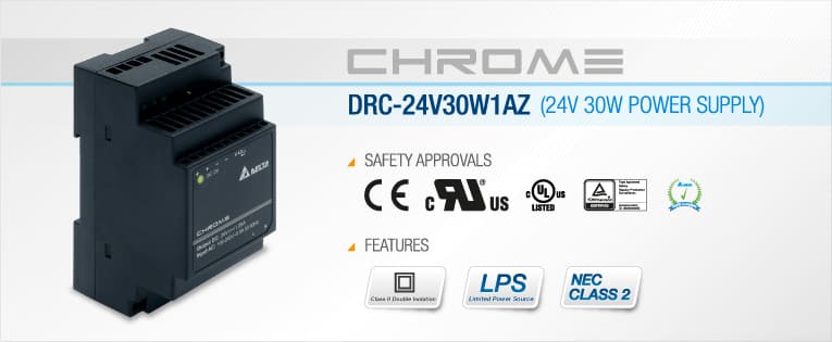 Delta Electronics extends its Chrome DIN rail power supply series with a 30W product offering 24V output voltage. The Class II double isolation power supply is designed for use in compact cabinets. The DRC-24V30W1AZ DIN rail power supply requires less installation space with its compact body measuring only 55.6mm thick and 91mm tall. The design not only does not require earth connection, it also has very low leakage current and is thus especially useful for home automations and the food and beverage industry.
