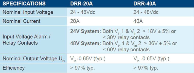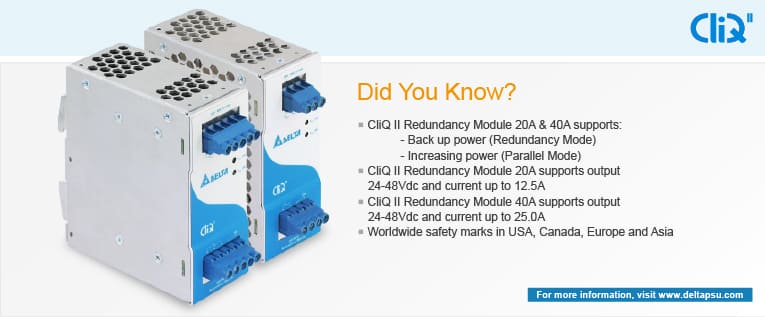 Delta Electronics adds two Redundancy Modules, DRR-20A and DRR-40A to its CliQ II series of DIN Rail power management products. They are compatible with both 24Vdc and 48Vdc power supplies, offering redundancy functionality. These modules can also be used for Parallel operation.