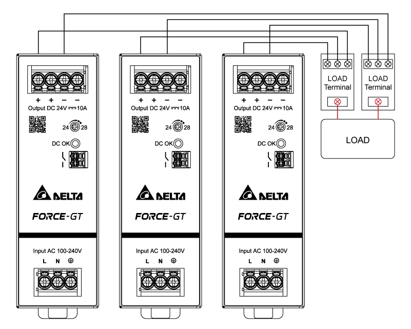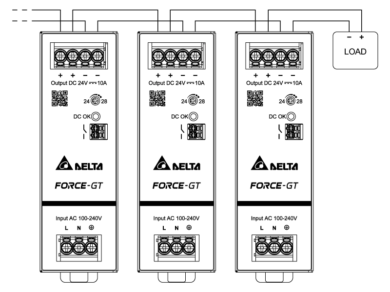 - If direct parallel connection is possible then special attention should be paid to the rating of the output connection terminals of the power supplies. A key factor here is that the total load current of the system will be carried by the output terminals of last power supply in the daisy chain. For example, connecting 3 x 10 A power supplies in parallel will result in 30 A at the last power supply (at maximum load). Therefore, the maximum current specified for the output terminals must not be exceeded.