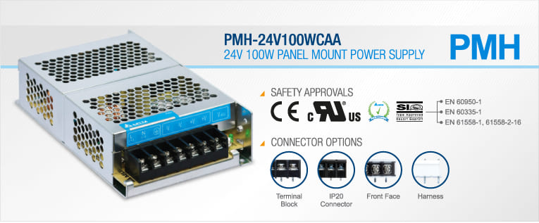 Delta Electronics extends its PMH panel mount power supply series with a 24V 100W model. The PMH-24V100WCAA offers universal input from 85Vac to 264Vac with nominal output voltage of 24V. The highly efficient convection cooling construction can operates from -20°C to 70°C.