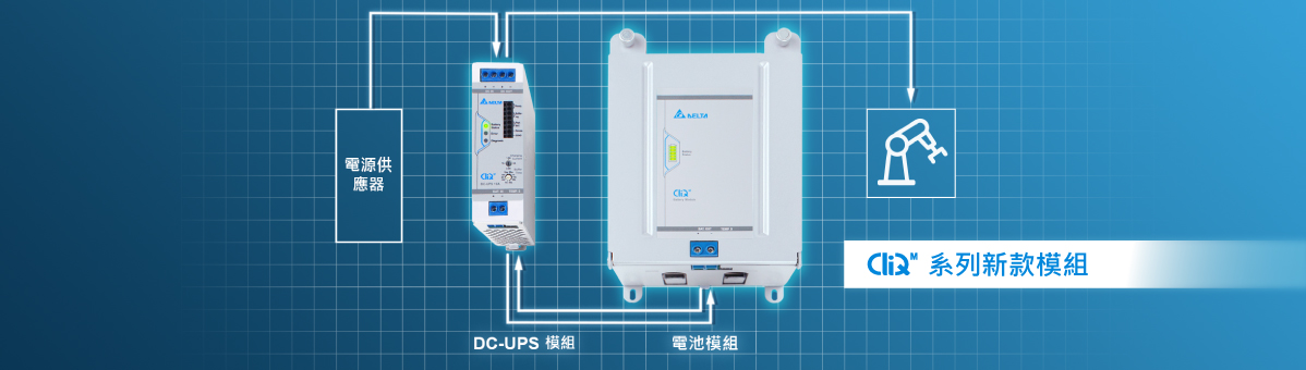 台達近期針對不斷電系統的應用,推出兩款 CliQ M 系列電源供應器專用的全新模組 - DC-UPS 模組及電池模組;搭配 CliQ M 系列應用,可有效縮短電源故障造成之停機時間。