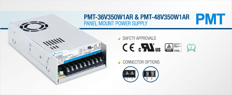 Delta Electronics is extending the 350W PMT panel mount power supply series with output voltage of 36V and 48V, namely, PMT-36V350W1AR and PMT-48V350W1AR. The single output products are encased in rugged yet lightweight and corrosion resistant aluminium body. Both models come with selectable AC input voltage switch. Despite the highly affordable price tag, PMT-36V350W1AR and PMT-48V350W1AR feature built-in fan with automatic fan speed control that allows efficient thermal management and use of energy. As with the rest of the PMT family, these products are designed for cost competitive applications without compromising the quality of the components and product specifications.