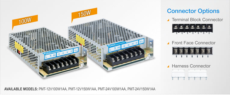 The PMT Panel Mount Power Supply series is now available with 100W and 150W output power. The single output products come in popular nominal output voltage options of 12V and 24V. The PMT series is designed to conform to harmonic current standard IEC/EN 61000-3-2, Class A.