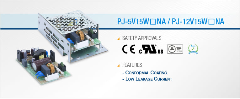 Like its predecessors, the PJ-5V15W and PJ-12V15W have options that offer metal chassis and/or cover for different installation preferences. Other superior features include low leakage and low Inrush current. With conformal coating on the PCBAs, the PJ series is protected against dust and chemical pollutants while only recognized Japanese capacitors are used to enhance product reliability. The PJ-5V15W and PJ-12V15W are certified for EMC standards according to EN 55011 for industrial, scientific and medical (ISM) radio-frequency equipment; EN 55022 for Information Technology Equipment (ITE) radio-frequency equipment and EMS according to EN 55024. Other major international safety certifications are also available.