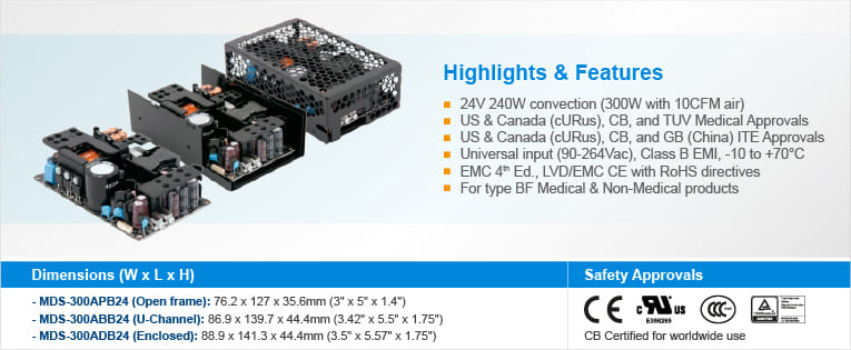 Documents for this product, can be found at www.DeltaPSU.com and search in the Standard Products drop down menu for Medical » Internal » 24V » 151-300W, and click on part number MDS-300APB24. Direct access to the data sheet can be found at the following link.