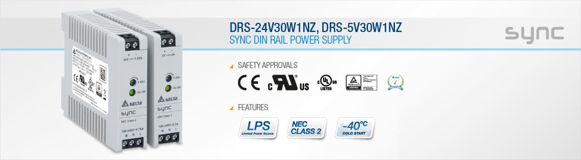 Delta Electronics is introducing the new DRS-30W series to the ultra compact Sync DIN rail power supply series. The new models of 24V/1.25A output (DRS-24V30W1NZ) and 5V/3A output (DRS-5V30W1NZ) are competitively priced and have improved performance at low temperatures (-20°C @ 80% load). The Sync series are able to start at the extreme low temperature of -40°C. It has a wide operating temperature range from -20°C to +70°C and a low earth leakage current < 0.5mA @ 264Vac.