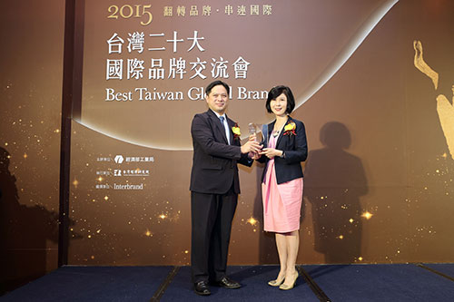 received the trophy of Best Taiwan Global Brands from Dr. Ming-Ji Wu (left),