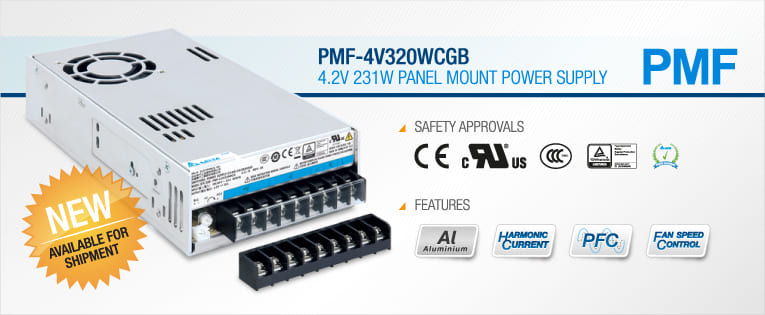 Delta Electronics has added a 231W panel mount power supply with 4.2V output for LED signage application to its PMF series. The PMF-4V320WCGB comes with universal AC input and is designed with built-in active PFC for demanding applications requiring high power factor and conforms to harmonic current IEC/EN 61000-3-2, Class A and Class D. The built-in fan with automatic speed control enables more efficient thermal management.