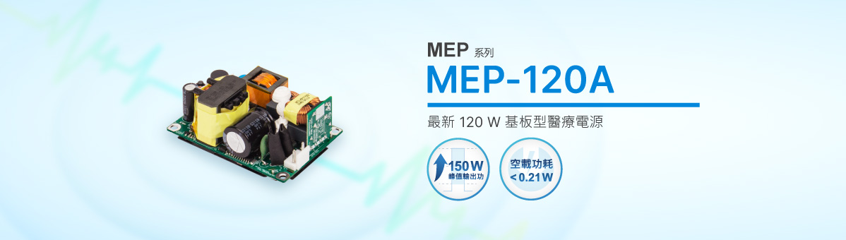 台達 MEP 基板型醫療電源系列,新推出輸出功率達 120 W 的新機型 MEP-120A。MEP-120A採2 x 3 x 1.2英吋薄型機身設計,並提供 12 V、15 V、18 V、24 V 四種電壓輸出選型。MEP-120A峰值輸出功率可達150 W 並維持10秒,具備 -30°C 至 70°C 寬溫操作特性,50°C 至 70°C 範圍採降額設計。MEP-120A 空載功耗小於 0.21 W,安規設計符合2 x MOPP 絕緣等級規範,可應用於BF型醫療設備,如呼吸機、監護儀等。