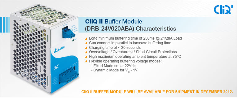 Delta CliQ II Buffer Module offers the most widely used output voltage of 24V and one of the longest buffering time of 0.25 sec (min) at 20A in wide input range from 22.8Vdc to 28.8Vdc. The Buffer Module utilizes maintenance-free electrolytic capacitors to store energy, thus eliminates the need of periodic replacement as compared to costlier batteries which also have shorter functional life span. Delta CliQ II Buffer Module comes with comprehensive protection features like overcurrent/overload, overvoltage and short circuit protection. Delta CliQ II series of products is IP20 compliant with full corrosion resistant Aluminium chassis and conformal coating on the PCBAs to provide protection against dust and chemical pollutants.
