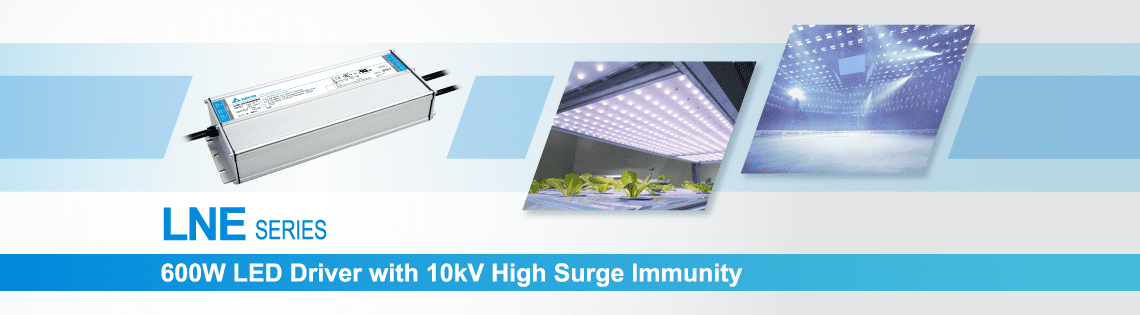 Delta Electronics’ latest range of 600W LED drivers comes rigorously tested for both indoor and outdoor lighting requirement. As part of the LNE series, the 600W design can withstand high surge immunity single pulse of 10kV for both common and differential mode. The 600W LED driver meets IEC 61000-4-2 Level 4 Criteria A, and IEC 61000-4-5 (common 6kV, differential 4kV). It comes in 36V (LNE-36V600WBGA) and 48V (LNE-48V600WBGA) output voltages. The products offer a wide operating temperature from -40°C to +70°C with convection cooling. The efficiency levels up to 96% and IP67 design makes the Delta LNE series an essential part of an energy efficient LED lighting power solution for sports arena lighting and agricultural lighting.