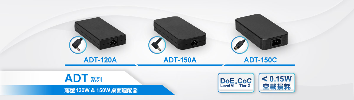 台達ADT 系列AC-DC 桌面適配器新增3個機種,達到DoE Level VI 等級及CoC Tier 2 能效要求。特色功能包含低於0.15W極低空載功耗、-10°C至+60°C寬範圍運行溫度,及可高達+40°C全功率運行溫度等。