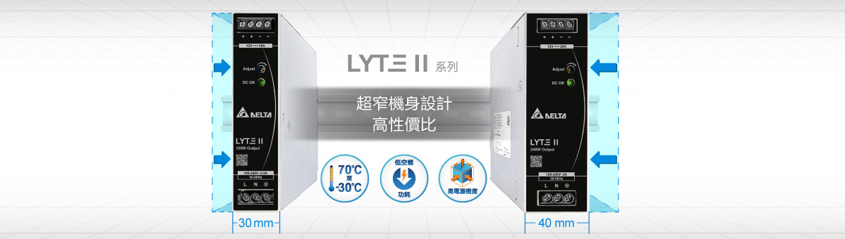 台達最新的LYTE II 系列DIN 導軌型電源供應器的機身寬度相對於LYTE I減少達30%,有助於節省用戶安裝空間。該系列提供12V、24V 與48V額定輸出電壓和120W與240W輸出功率。LYTE II 系列的過流保護採恆電流設計,可以用於電感負載與電容負載應用。