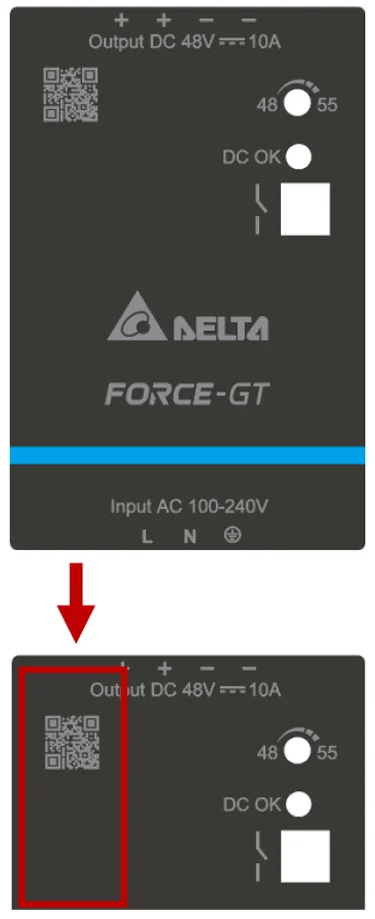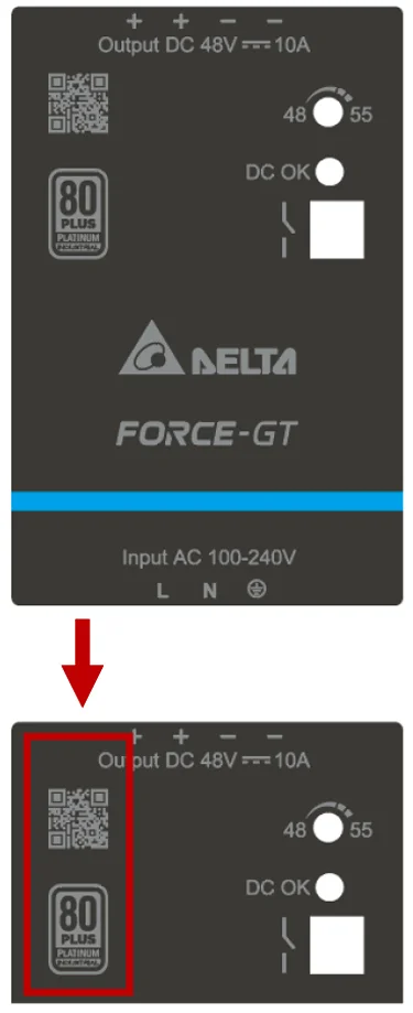 Force-GT 系列 480W 單相型號 (DRF-XXV480W1GXA 系列) 的正面標籤將更新,加入 80 PLUS Platinum 認證符號,以突出此產品高能效。